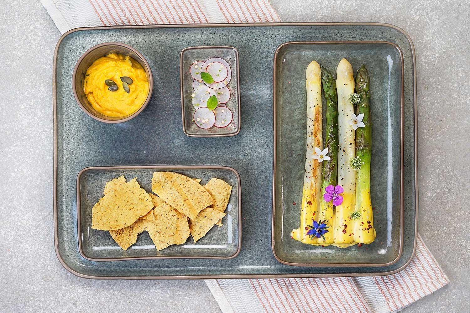 Bento-Concept is een opvallend en hip servies uit porselein. Zowel aan de binnenkant als aan de buitenkant kreeg het een grijsgroene kleur, wat de reeks een sterke natuurlijke uitstraling geeft. De rechthoekige vormen en de ruwe rand benadrukken zijn ruige karakter.