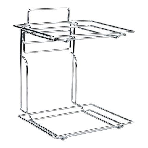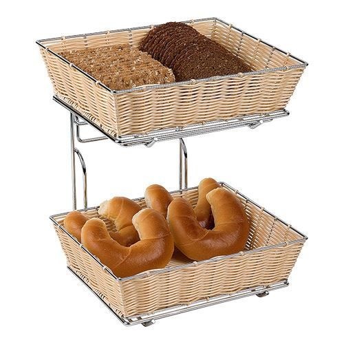 Prachtige serie verchroomde étageres en manden van polypropyleen vlechtwerk.Perfect om uw ontbijt/lunchbuffet te presenteren