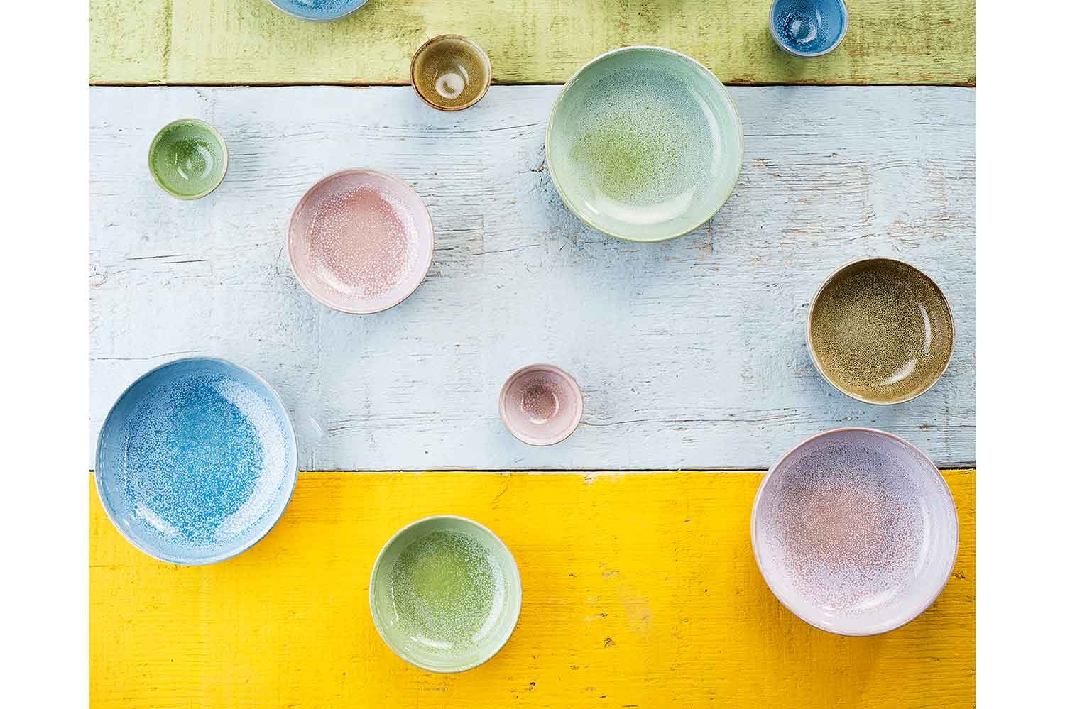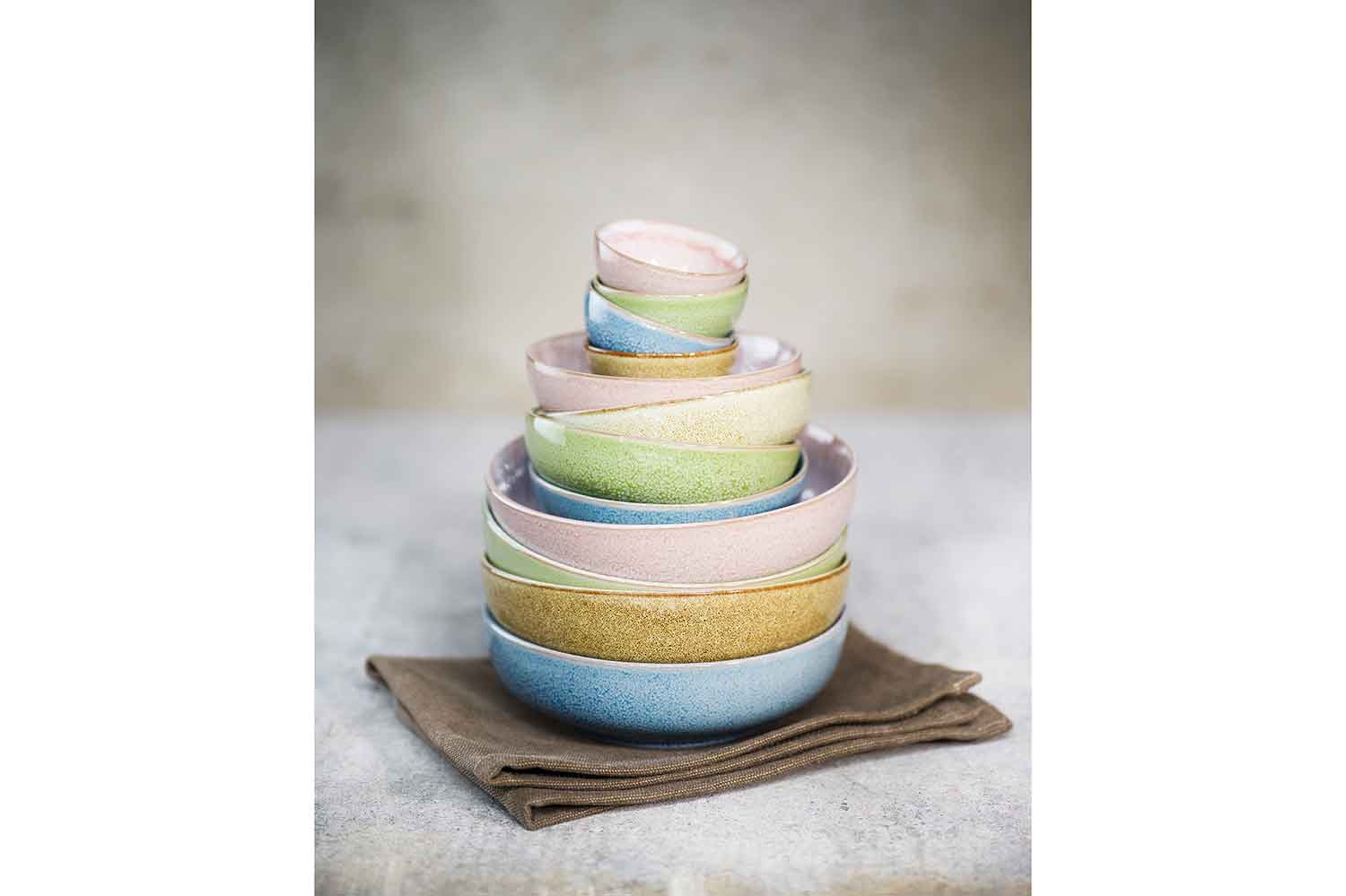 Een collectie sprankelende schaaltjes in aardewerk. Allemaal voorzien van een gespikkelde gladde afwerking. De serie heeft schaaltjes in drie formaten en vier zachte kleuren die samen uw aperitieftafel opvrolijken. Gebruik de grotere schaaltjes voor chips en hapjes. De leuke minischaaltjes zijn ideaal voor sausjes.
